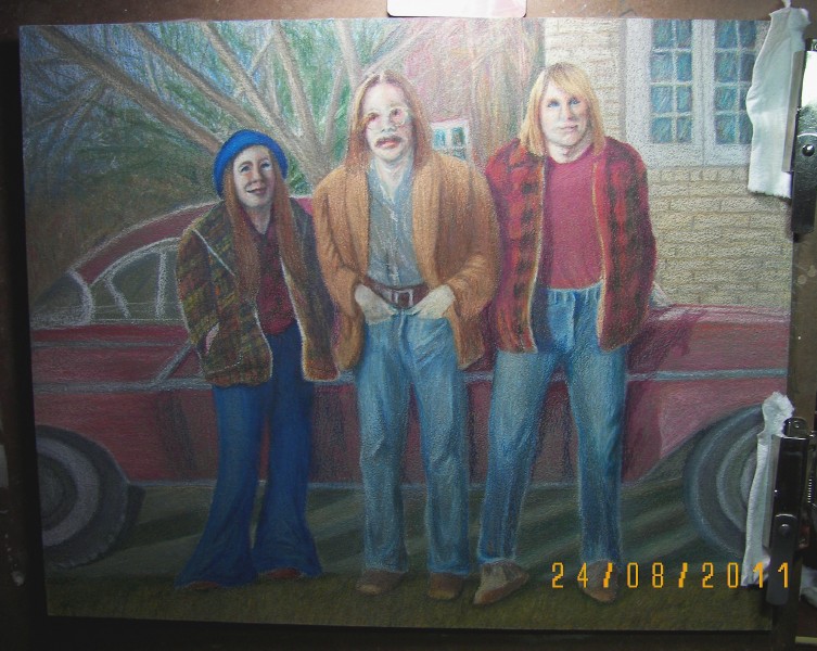 I have been putting hours and hours into this one. Deadline Sept. 1, (see previous post) if that isn't a post mark date, I will drive the CD there. At any rate I started with the faces, and felt they were fair enough that I could go on. Now finishing the faces is all I have left and it is getting out of wack some. Hope I get a grip and finish this with some satisfaction. It is 16x20, colored pencil on panel. In case you haven't guessed, I am on the far right and the other two hip characters are my two younger brothers. As well as faces, which I am close to overdoing now, I wasn't sure about the car or blending in the background the way I wanted, but I am fairly pleased with both of those two issues at this point. That car was my beloved first, a 58 Chevy that I worked and paid for myself.